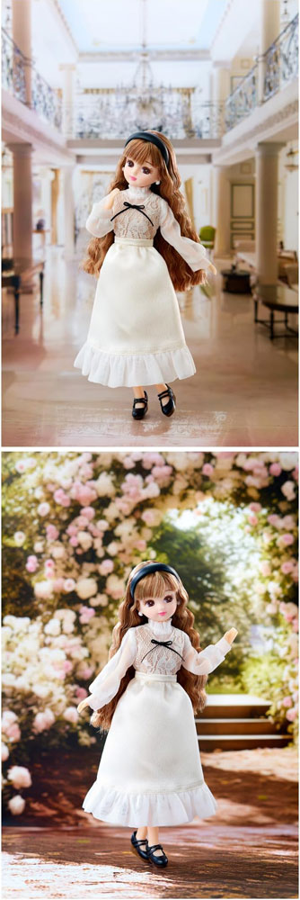 ロマンティックなフリルやレースをホワイトトーンで統一して、ブラックのアクセントを効かせた大人ドーリーなリカちゃんです。