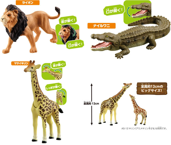 ●マサイキリンは首、しっぽが動きます。首は柔らかく動きます。キリン同士が首をぶつけ合って戦う「ネッキング」という習性を再現した遊びができます。(マサイキリンは全高約12cmのラージサイズです。)
