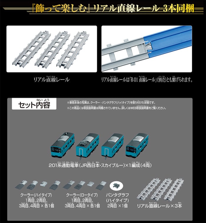 201系通勤電車(JR西日本・スカイブルー)1編成(4両)(1)、クーラー(ハイタイプ)(4)、クーラー(ロータイプ)(4)、パンタグラフ(ハイタイプ)(1)、リアル直線レール(3)、部品注文書(1)、
