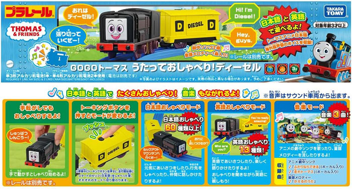アニメ「きかんしゃトーマス」に登場するキャラクター、ディーゼルが日本語と英語でたくさんおしゃべり!音楽も流れるよ!
