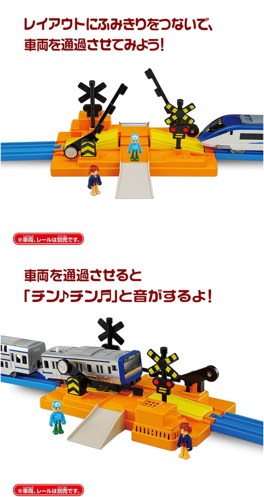 車両が通ると遮断かんがおりて、「チン♪チン♪」と音が鳴るふみきりセットだよ!