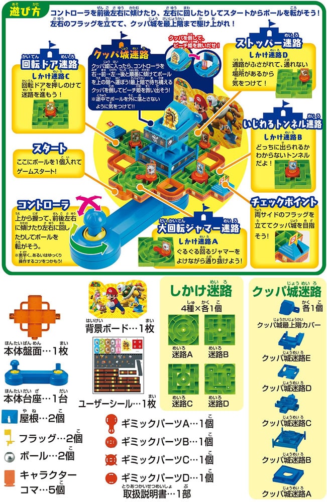 新しいギミックを搭載したしかけ迷路盤4枚付き! 「大迷路ゲームマリオチャレンジ」の迷路盤とも入れ替えられて、何回でも楽しめます!