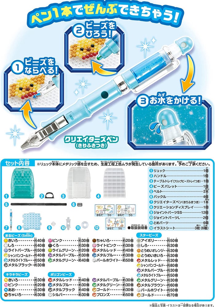 ・リュック型ケース、ハンドル、ビーズパレット、テーブルトレイ(フリップビーズトレイつき)、クリエイターズペン(きりふきつき)、ベルト×2、バックル×4、クリエーションディスプレイ、ジョイントパーツSS×12、ジョイントパーツL×2、イラストシート3枚(6種)