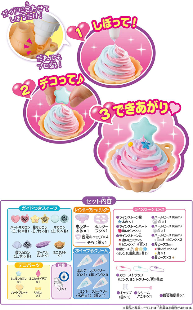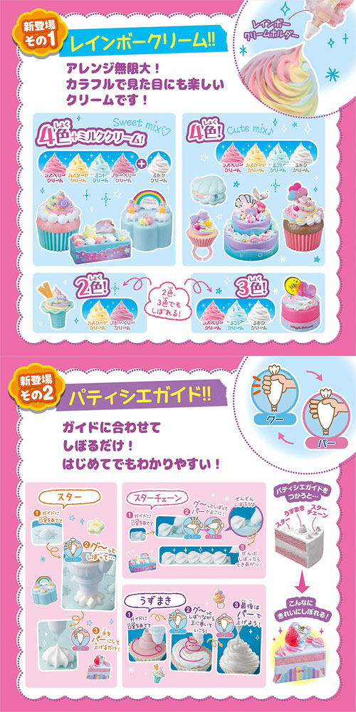 4色のクリームが一度にしぼれちゃう「レインボークリームホルダー」と上手にしぼれる「パティシエガイドつきスイーツ」が入ったセットだよ。
