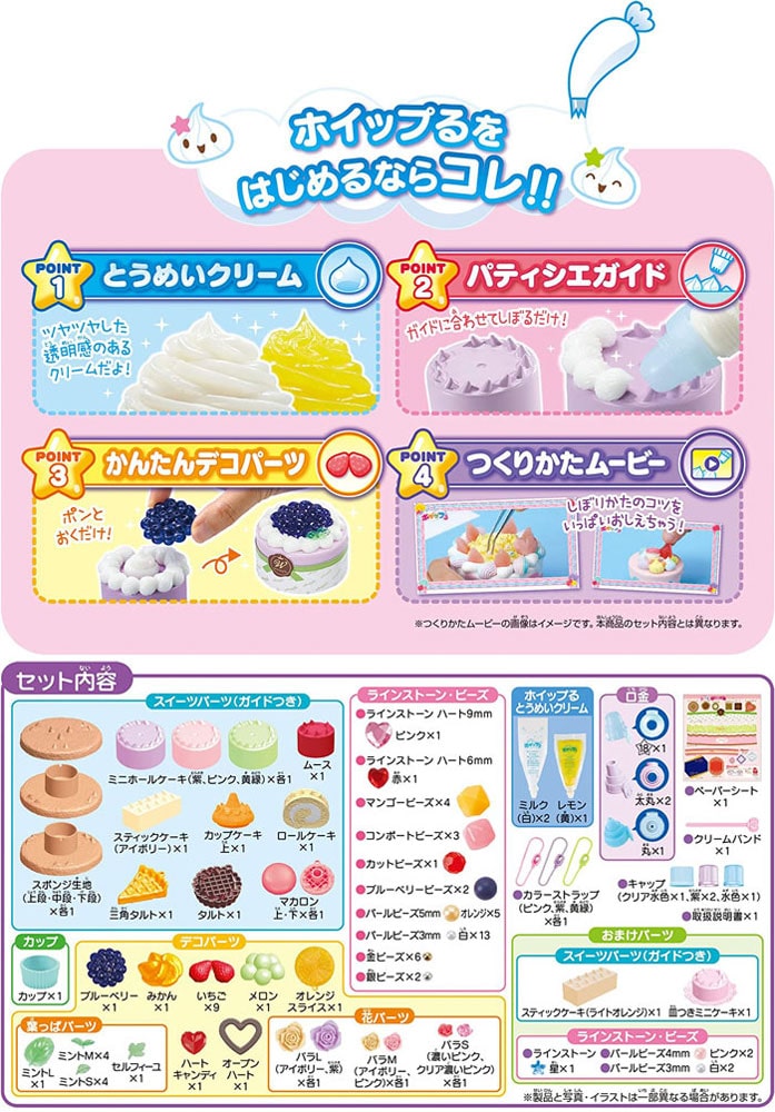 ★誰でもキレイにしぼれるパティシエガイド付きスイーツとデコレーションしやすいデコパーツ入り。