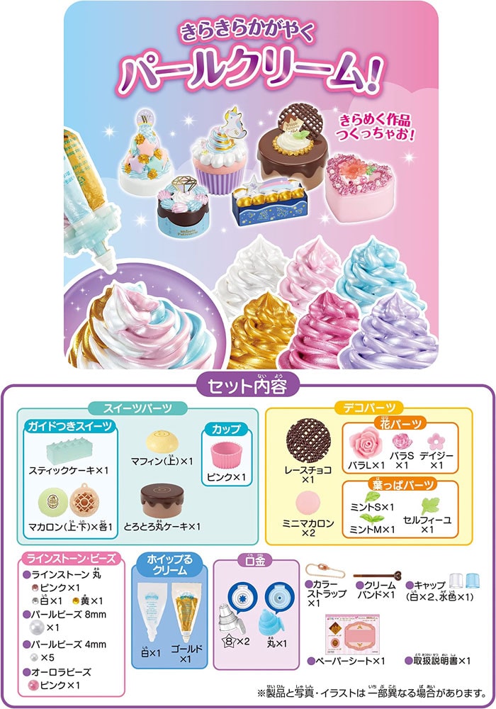 新登場のキラキラかがやくパールクリームで、ゴールドがきらめくエレガントなスイーツ作品がつくれるミニセットです。マカロンはキーチェーンに、マフィンは小物入れになります。