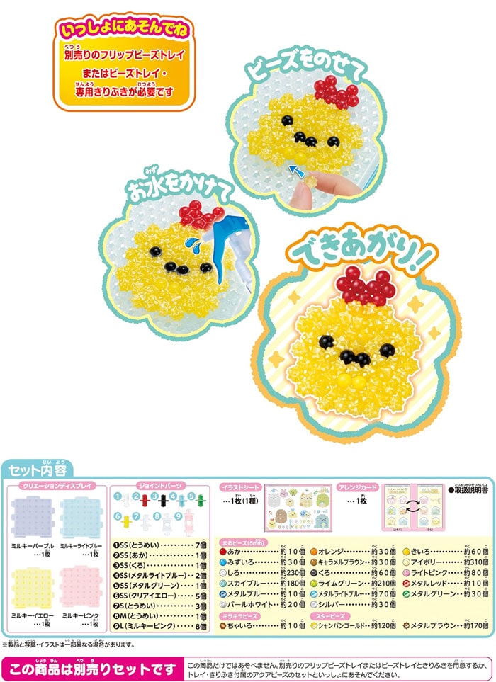 ★※こちらの商品はビーズ・イラストシート・クリエーションディスプレイ・アレンジカードがセットになったオプションパーツ商品です。別売りのフリップビーズトレイまたはビーズトレイと専用きりふき、またはそれらがセットになったアクアビーズ本体の商品と一緒にお楽しみください。★