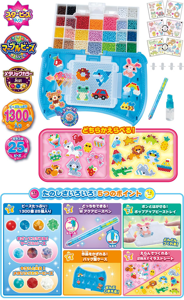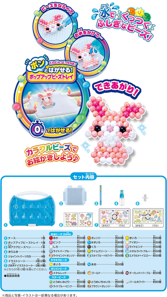 ・ケース、ポップアップビーズトレイ、Wアクアビーズペン、きりふき、ジョイントパーツSS×4、イラストシート2枚(2種)、2WAYイラストシート2枚(4種)