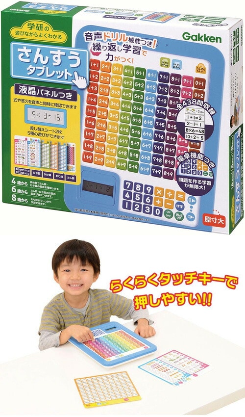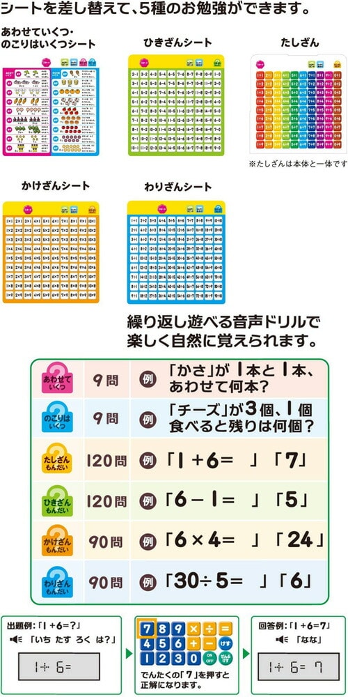 問題は全部で438問を収録、また、計算機機能と、液晶パネルを使って、ご家族の方やお子さまご自身で問題を作る遊びもできます。