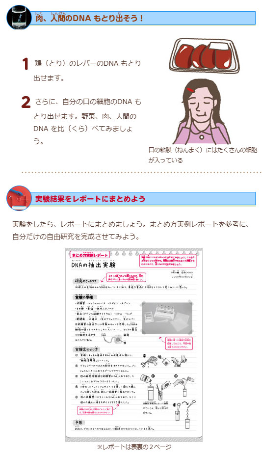 DNAとは、わたしたちが生きていくためい必要なあらゆる情報がつまった「生命の設計図」。「DNAを調べよう」は、身近な食品や自分の口腔細胞からDNAをとりだせるキットです。