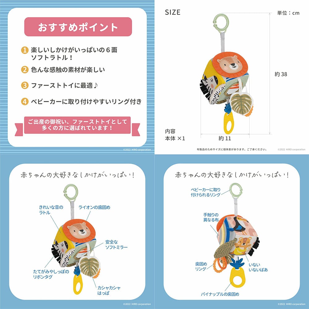 大きな歯がためがついたライオン、しっぽやたてがみがリボンタグになっているしまうまや鳥、いないいないばああそびで現れる子ライオン、他にもソフトミラーやシャカシャカ音のする葉っぱなど、あそびの要素が盛りだくさん。