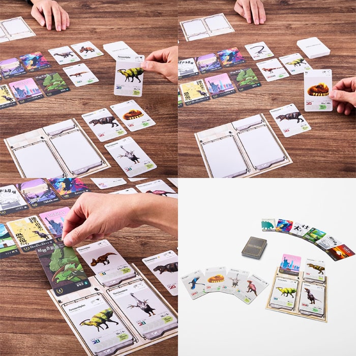 博物館の館長になって、他では出来ないような自分だけの恐竜展を開催しよう!肉食恐竜やアメリカ大陸に生息していた恐竜だけを集めた展示にするもよし、歯がない恐竜や色が分かっている恐竜だけを集めた珍しい展示にするもよし。色んなテーマの展示をたくさん開催してポイントを稼ごう!子どもから大人まで楽しめて、恐竜の知識が学べる知育カードゲームです。
