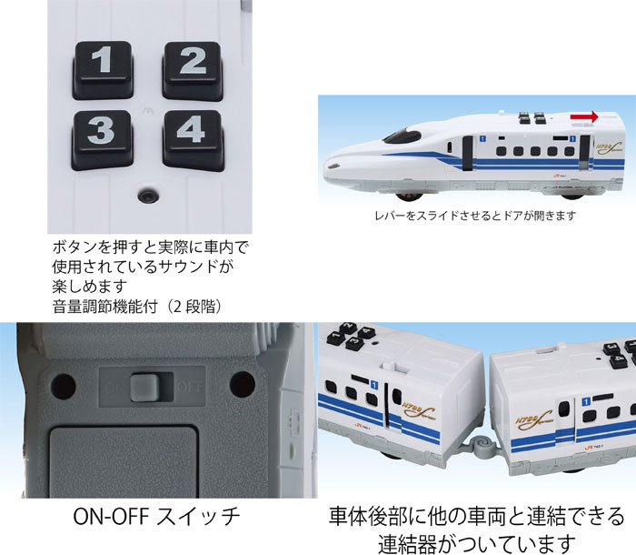 その他、サウンドに連動してヘッドライトが点灯、スライドレバーでドア開閉、後部連結器、音量調節など機能満載のサウンドトレインです