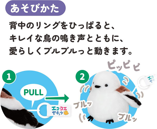おしりのリングを引っ張ると、キレイな鳥の鳴き声とともに愛らしくブルッブルッと動きます。