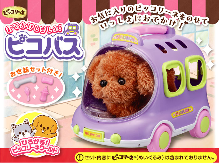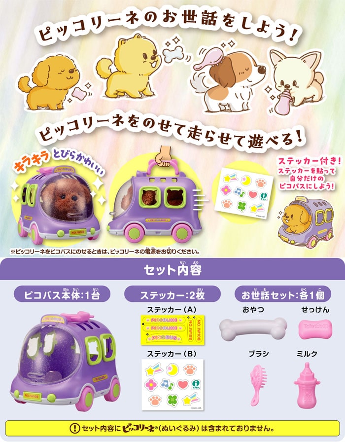 ピコバス本体:1台、お世話セット:各1個(おやつ・せっけん・ブラシ・ミルク)、ステッカー:2枚