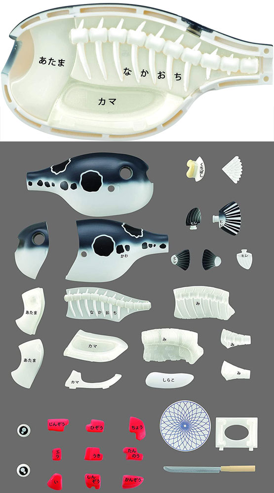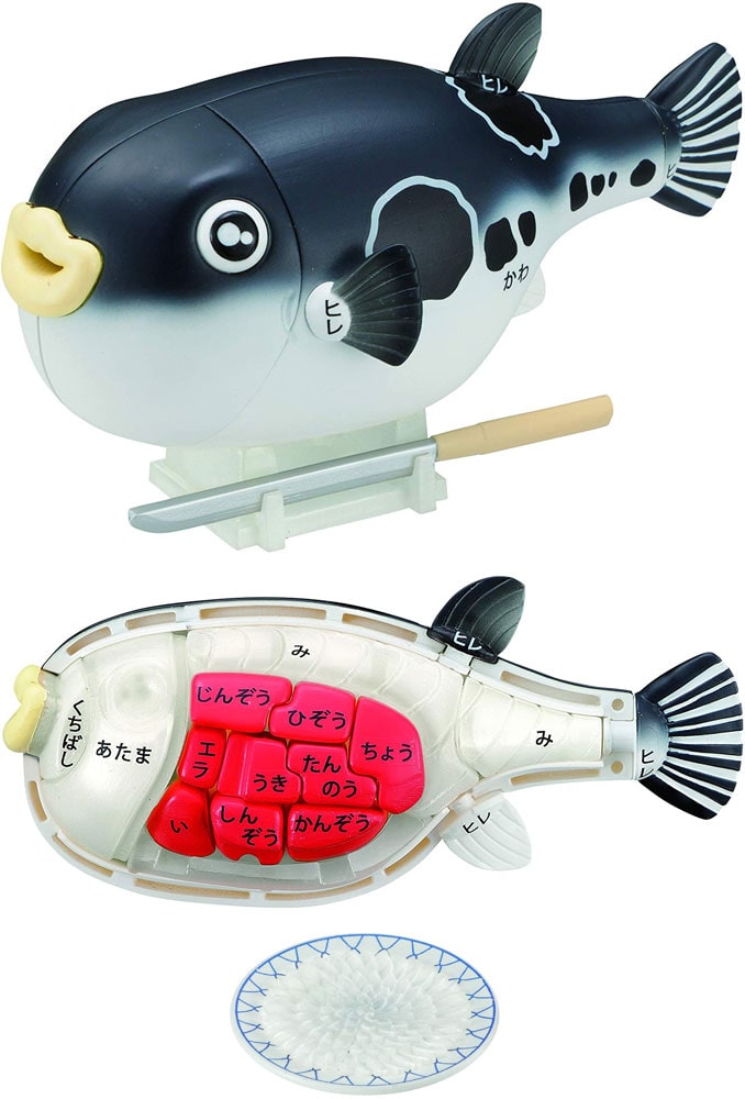 34パーツ(可食部位パーツ、非可食部位パーツ)、皿パーツ、台座、包丁パーツ、ふぐ調理師免許証シート(組み立て方ガイド)