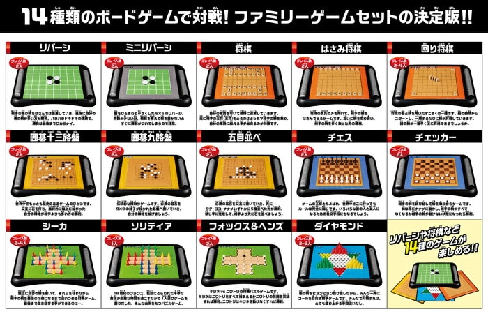 リバーシや将棋、囲碁など14種類のゲームが楽しめるゲームセットです。