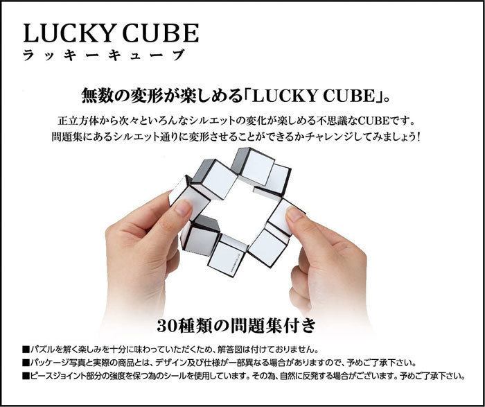 さらに繋ぎ目を折ったり伸ばしたりすることで、幾何学的な形に変形し、2つのピースを組み合わせることで、正立方体に変形します。