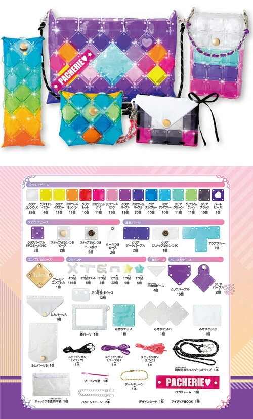 ピース220個、ジョイント229個、中袋1個、ボールチェーン1本、ハンドルチェーン2本、ショルダーストラップ1本、ソーイング針1本、リボン3本、チャーム1個、デザインシート1枚、アイディアBOOK1冊