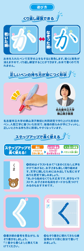 水で書くので服や手を汚さず、乾かせば何回でも練習できます。