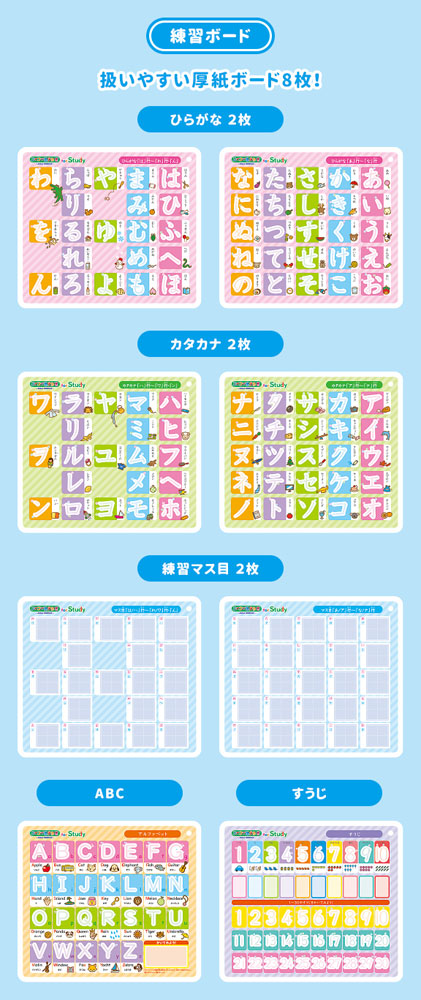 練習ボード8枚(ひらがな2枚、カタカナ2枚、練習マス目2枚、すうじ1枚、ABC1枚)、専用細書きペン1本、リング付ペンホルダー1個