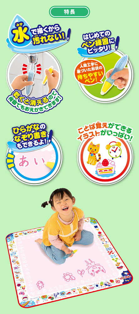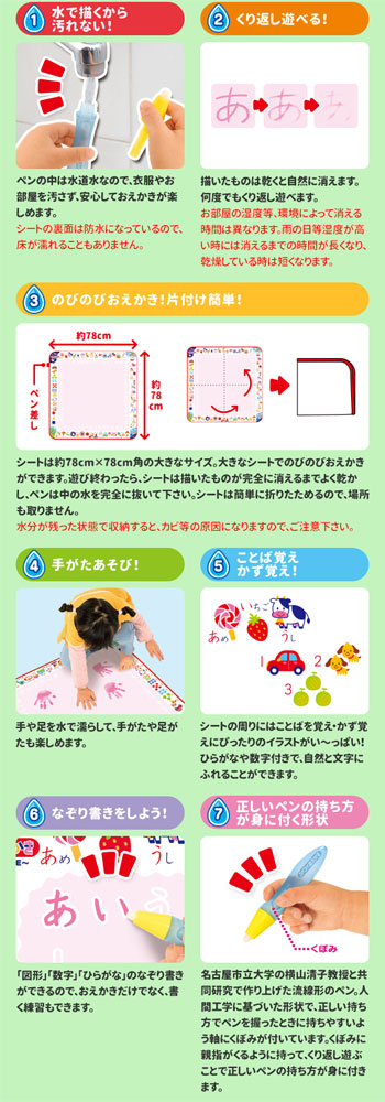 おえかきシートはお水で発色し乾くと消えるので、洋服や周囲を汚すことなく何度でもくりかえしあそべます。