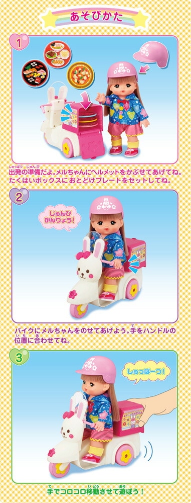 メルちゃんを乗せて、手ころがしであそべるうさぎさんデザインのバイクです。