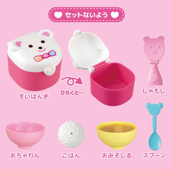 すいはんき、しゃもじ、おちゃわん、ごはん、おみそしる、スプーン