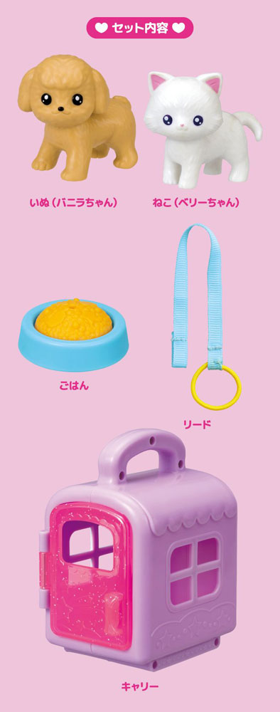 いぬのバニラちゃんにリードをつけておさんぽしたり、ねこのベリーちゃんにごはんをあげたりしてね。