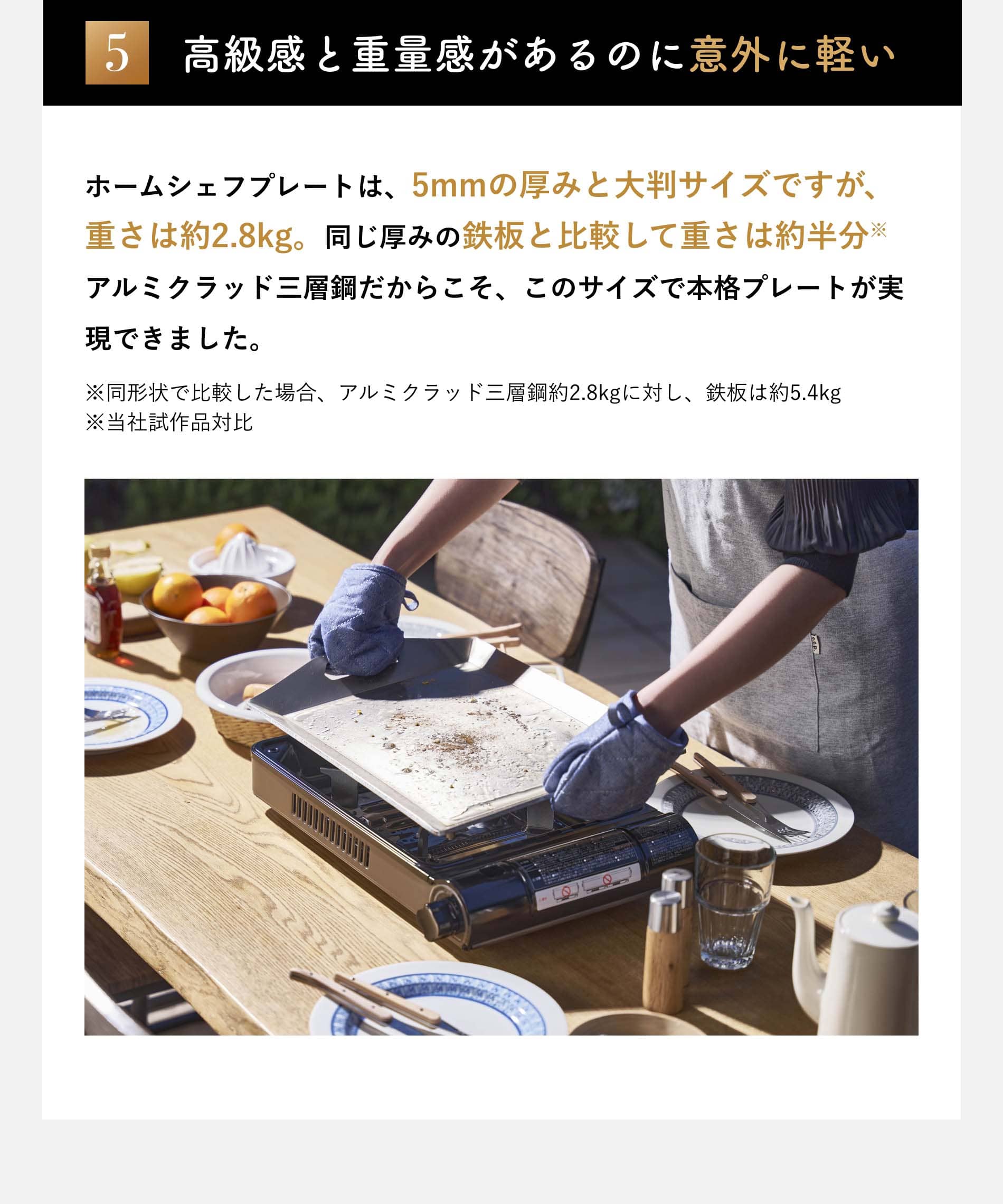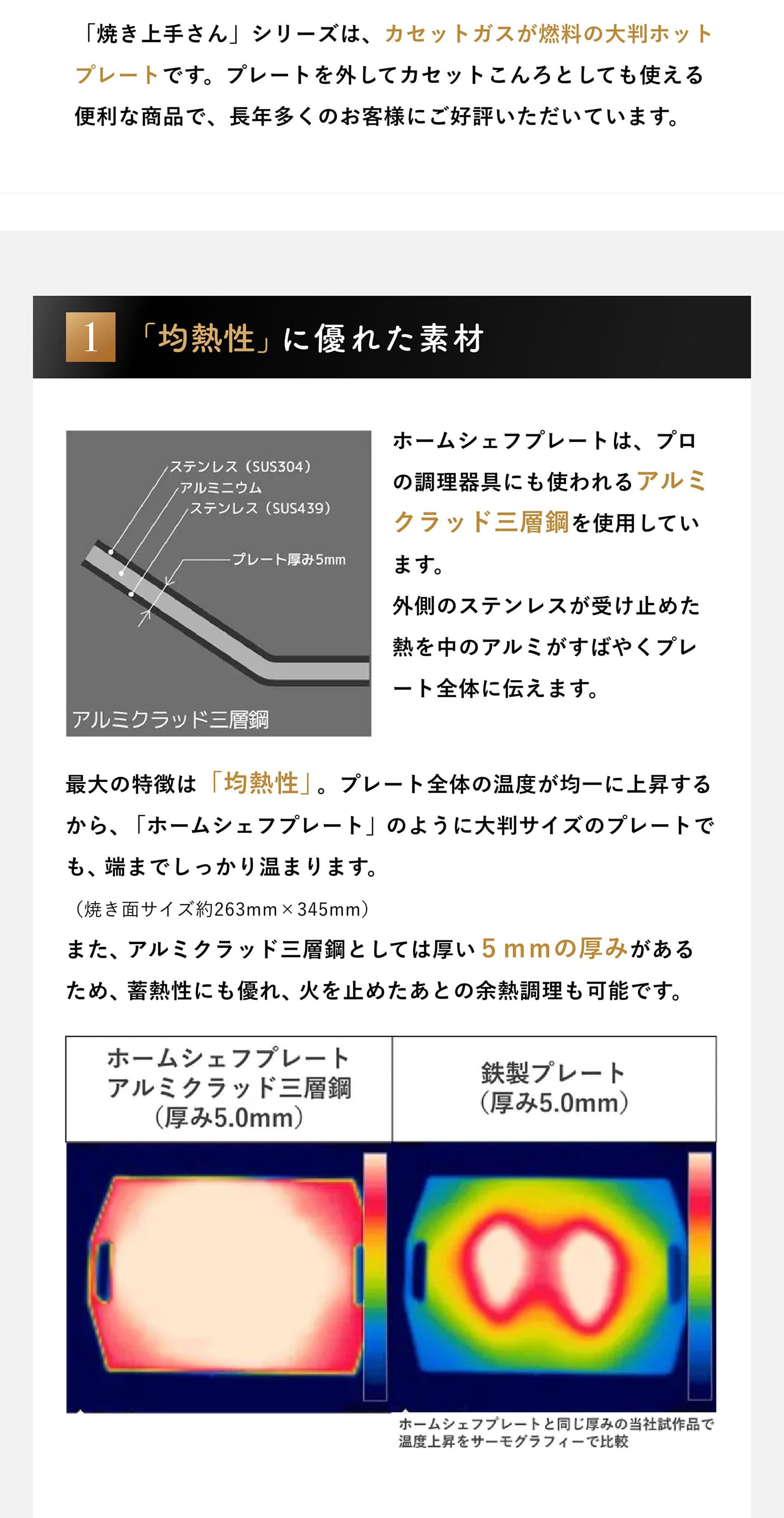 ■5mmのアルミクラッド三層鋼で焼きムラなし。旨味を閉じ込め食材の持つおいしさを引き出す