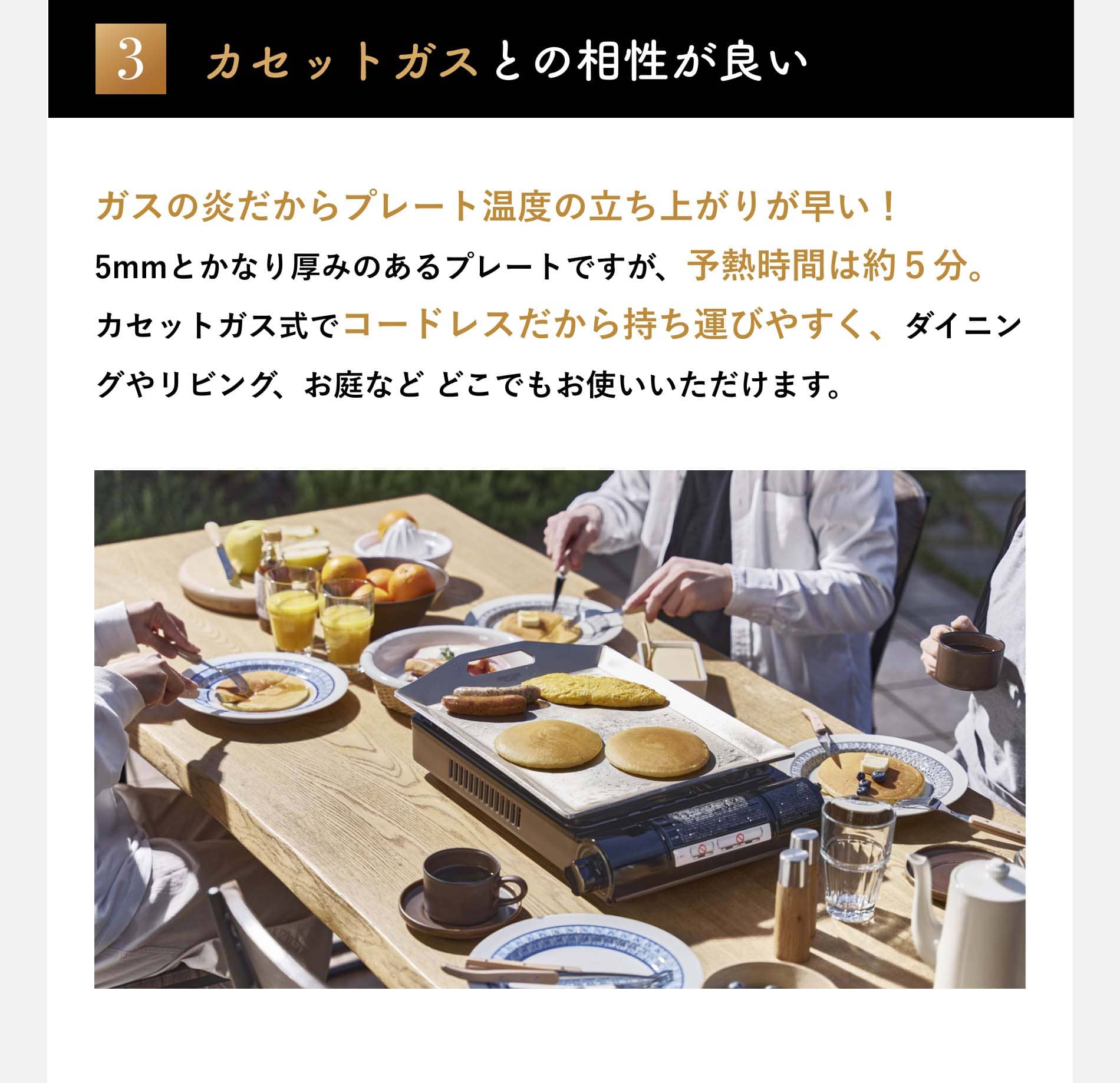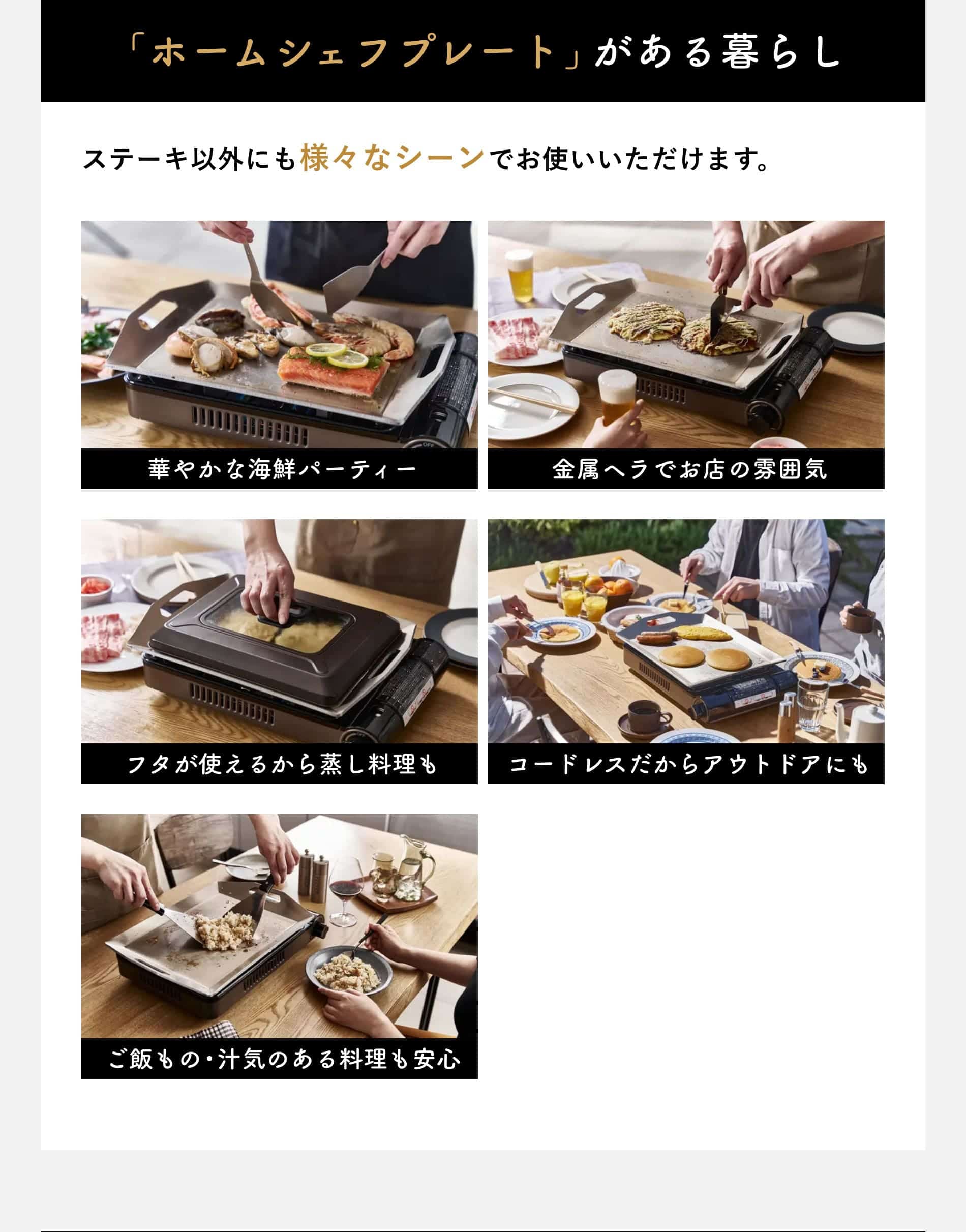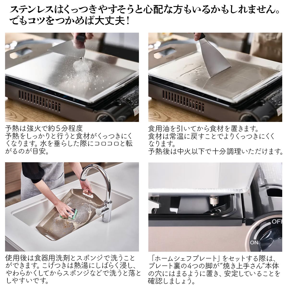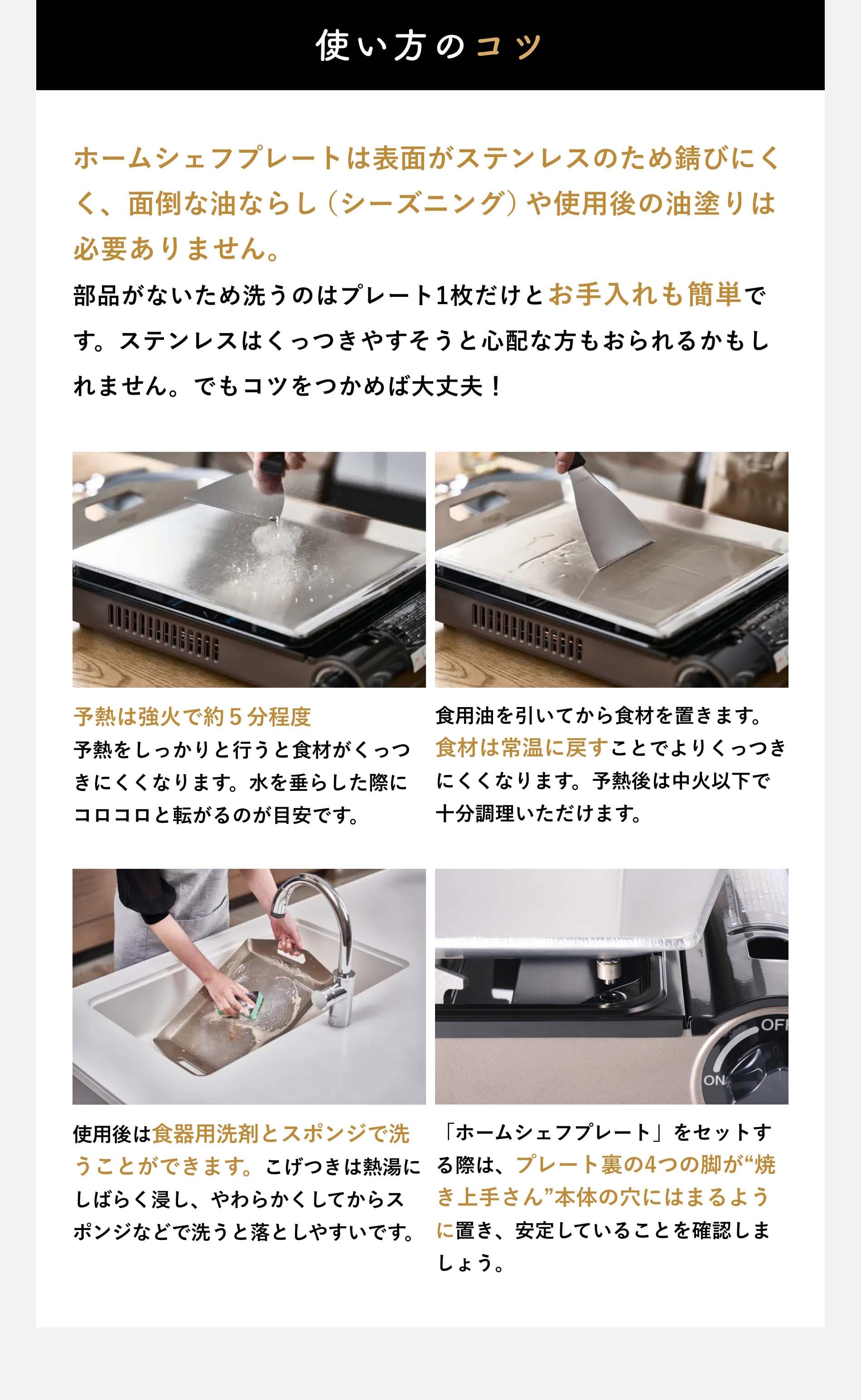 使用方法 Step1 予熱は強火で約5分程度、予熱をしっかりと行うと食材がくっつきにくくなります。水を垂らした際にコロコロと転がるのが目安。 Step2 食用油を引いてから食材を置きます。食材は常温に戻すことでよりくっつきにくくなります。予熱後は中火以下で十分調理いただけます。 Step3 使用後は食器用洗剤とスポンジで洗うことができます。こげつきは熱湯にしばらく浸し、やわらかくしてからスポンジなどで洗うと落としやすいです。 「ホームシェフプレート」をセットする際は、プレート裏の4つの脚が“焼き上手さん”本体の穴にはまるように置き、安定していることを確認しましょう◎ |