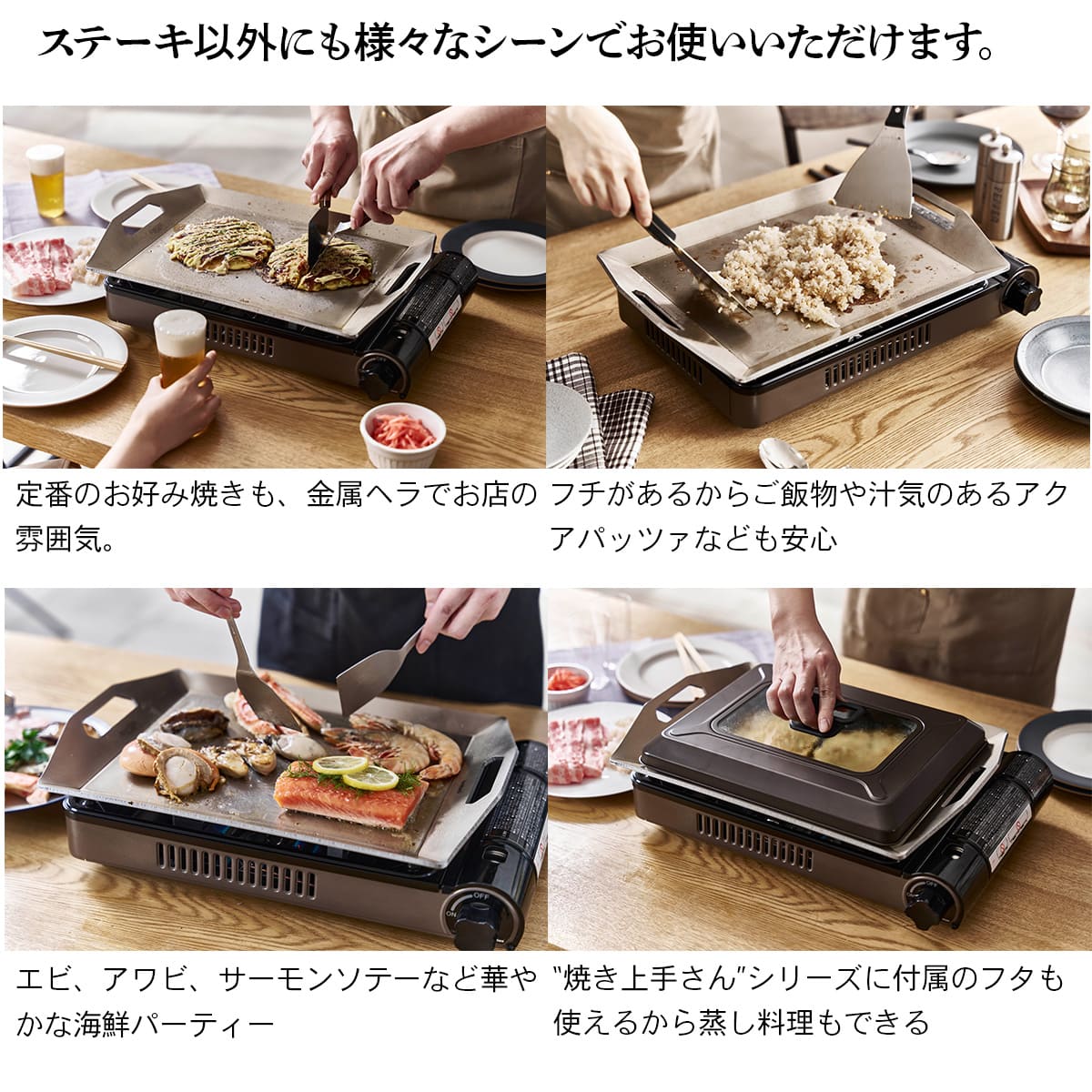 ステーキ以外にも様々なシーンで使用可能 定番のお好み焼きも、金属ヘラでお店の雰囲気。また、フチがあるからご飯物や汁気のあるアクアパッツァなども安心◎ “焼き上手さん”シリーズに付属のフタも使えるから蒸し料理もできる! |