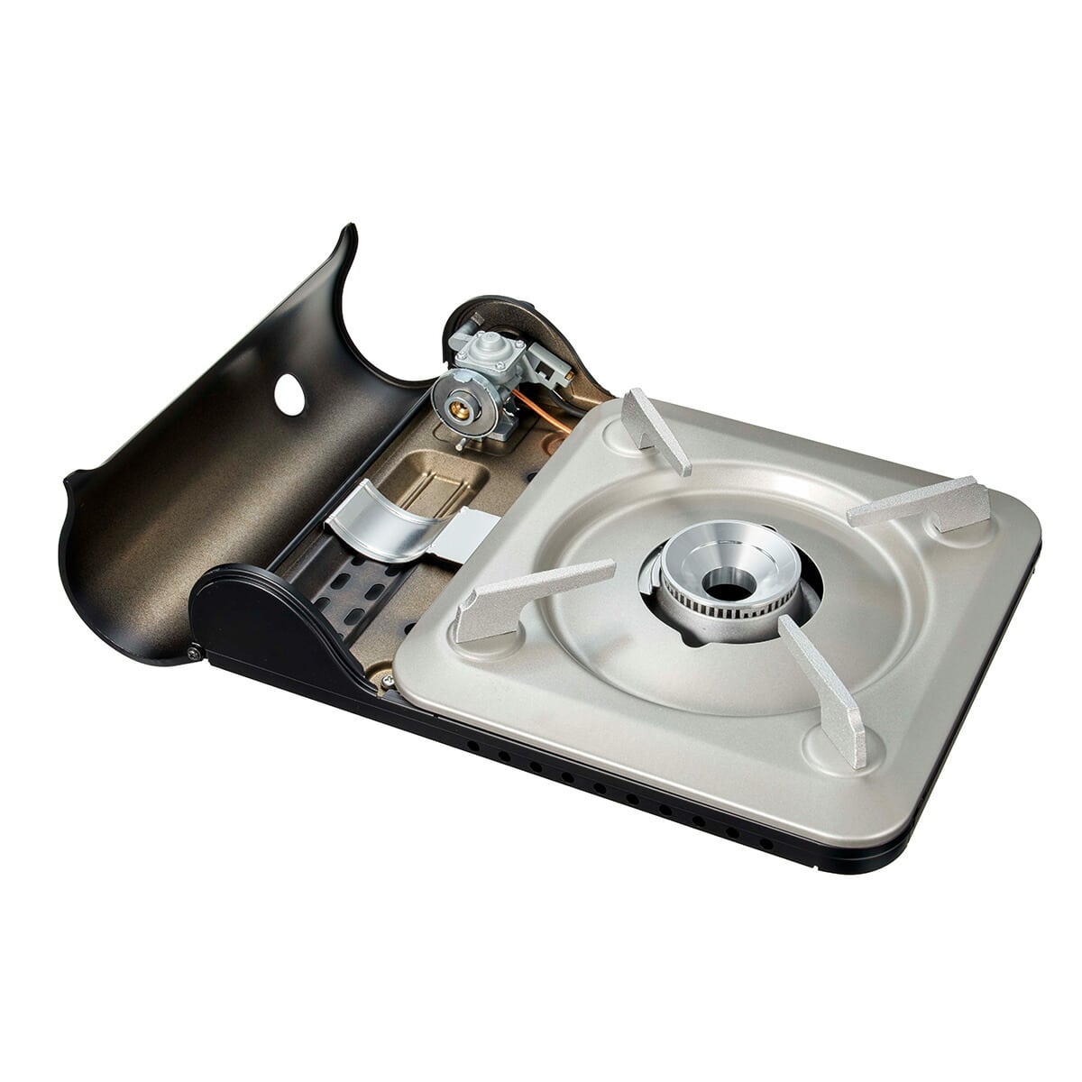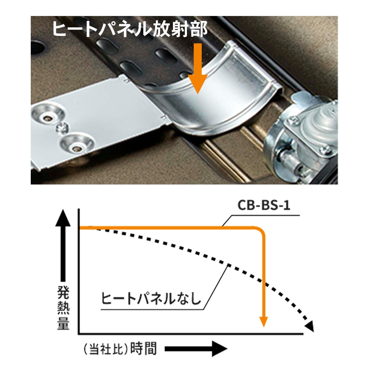 火力を落とさず、無駄なくガスを消費するヒートパネル方式 カセットボンベを使用する器具は、時間とともに火力が低下する性質があります。これは燃焼によりボンベの温度が低下し、ガスの気化が悪化してしまうからです。これを補うため、ボンベを適度に暖めて器具の火力を維持させる「ヒートパネル」を搭載。これにより最後まで火力を維持し、またガスを無駄なく消費することができます。 |