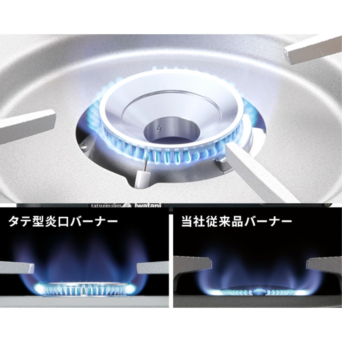 ムダ火抑制、タテ型炎ロバーナー! 炎の出口「炎口」を従来品よりタテ長の形状にしました。「炎口」がタテ長だと炎が外に広がりにくくなり、鍋底からこぼれるムダ火が抑制されます。 |