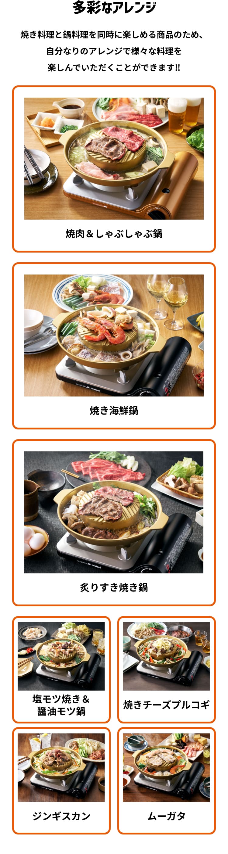 「焼き部分」で肉やシーフードなどを焼き、「鍋部分」で野菜や豆腐などをスープで煮込むと内側で焼かれた肉やシーフードの旨味が、鍋部分に流れ込み、旨味いっぱいの鍋を楽しむことができます!