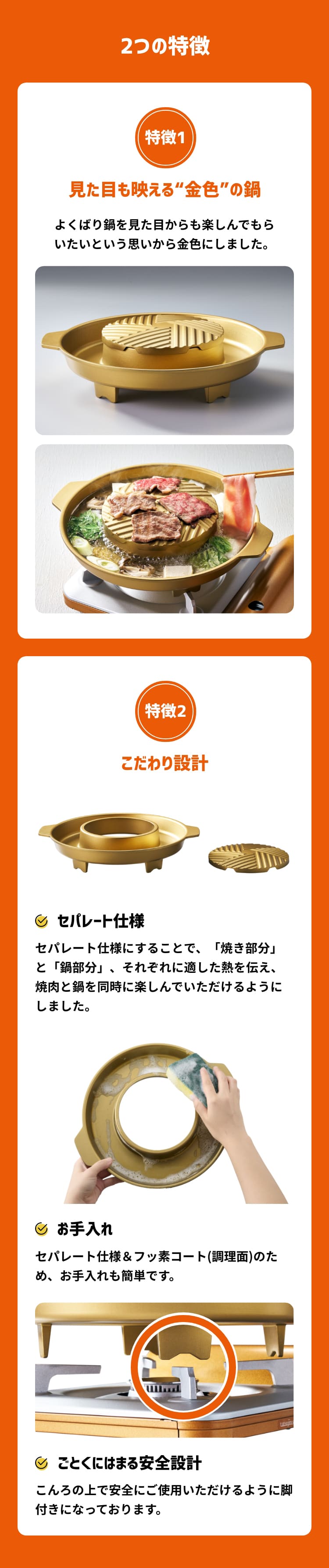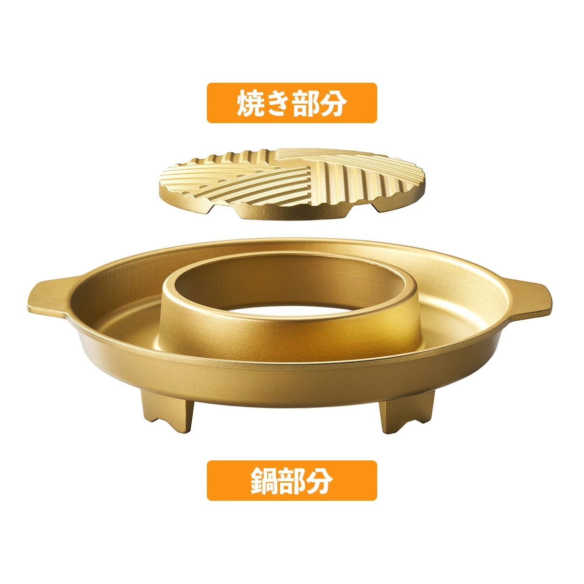 「焼き部分」「鍋部分」 それぞれに適した熱を伝えるセパレート構造のプレート 【焼き部分】 直火ならではのカリッとジューシーな焼肉が焼きあがります。 焼いたお肉の脂は溝を伝って鍋部分に流れ込み、お鍋に旨味とコクを与えてスープの味を一層美味しく仕上げます。 海鮮など、焼肉以外の食材もしっかりと焼くことができます。 【鍋部分】 深さ約3.5cm、容量は約750mlで、煮るだけでなく、ジンギスカンのような焼き野菜等の調理もお楽しみいただけます。 |