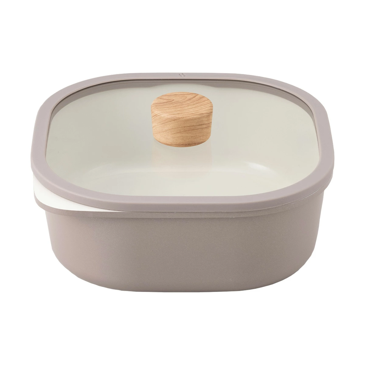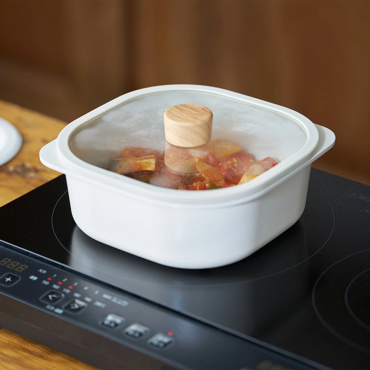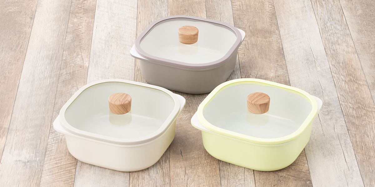 丸みのある20cm×20cmのスクエアデザイン。ガラス蓋付きで「煮込み料理」や「蒸し料理」「オーブン料理」「炊飯」などマルチに活躍。
