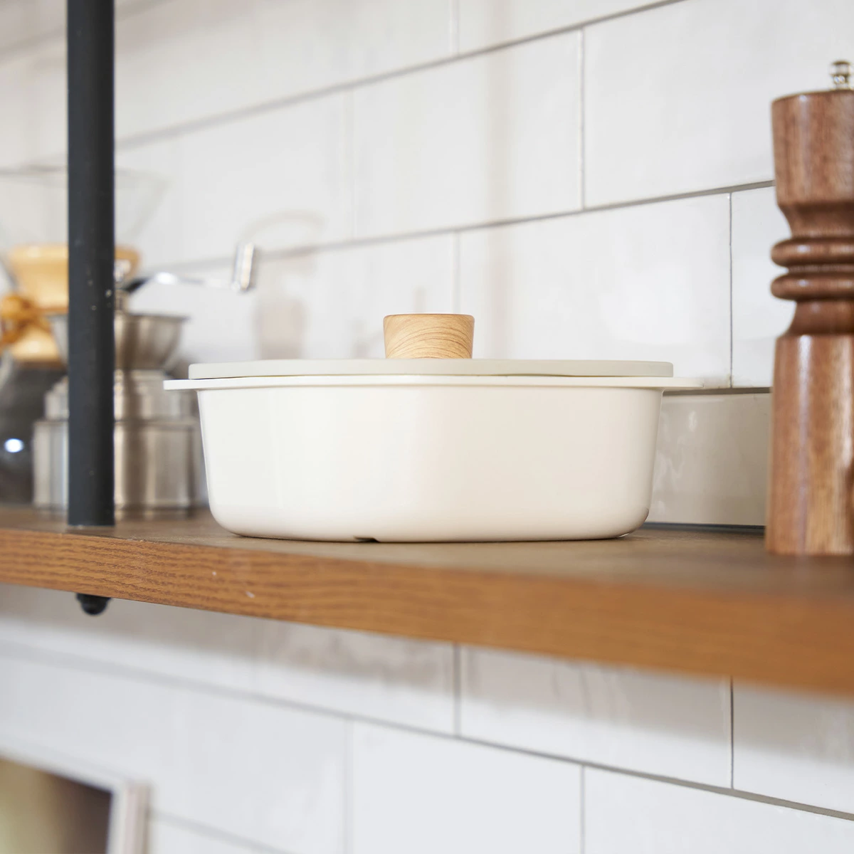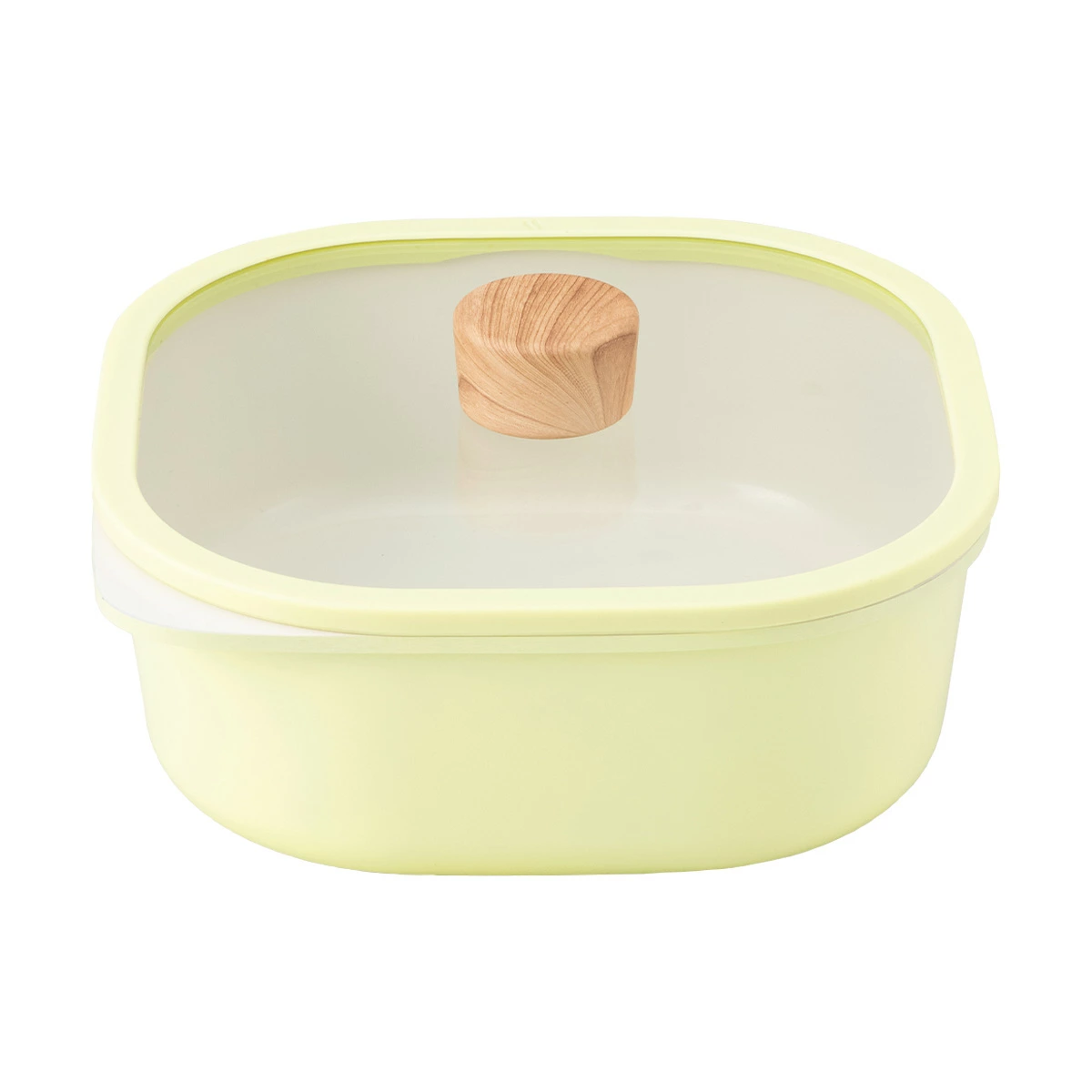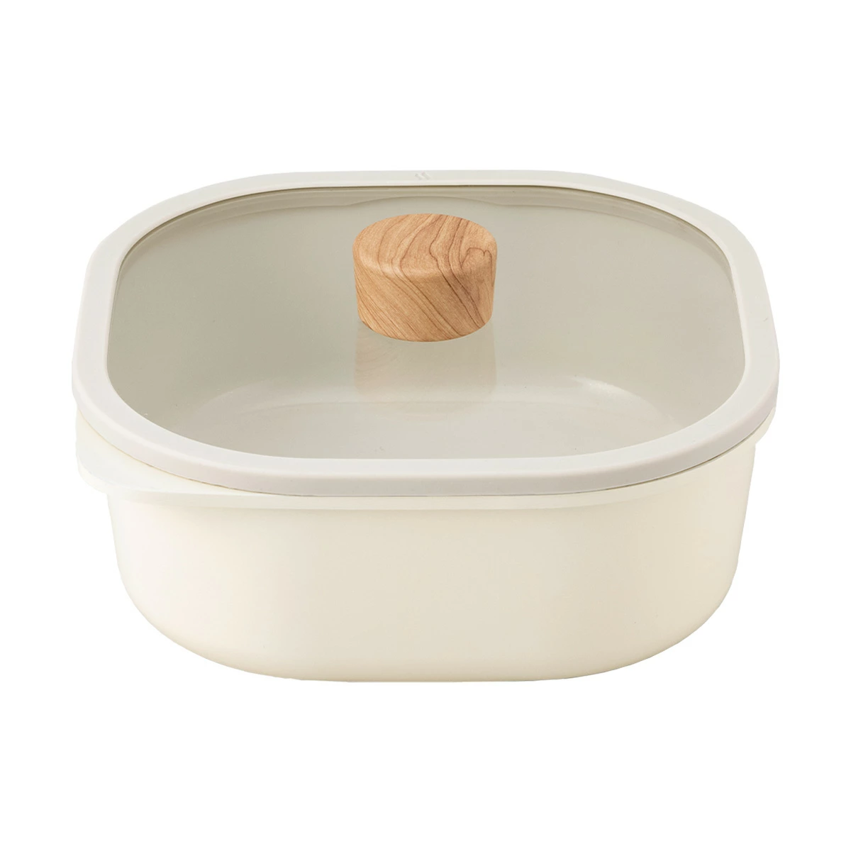 丸みのある20cm×20cmのスクエアデザイン。ガラス蓋付きで「煮込み料理」や「蒸し料理」「オーブン料理」「炊飯」などマルチに活躍。