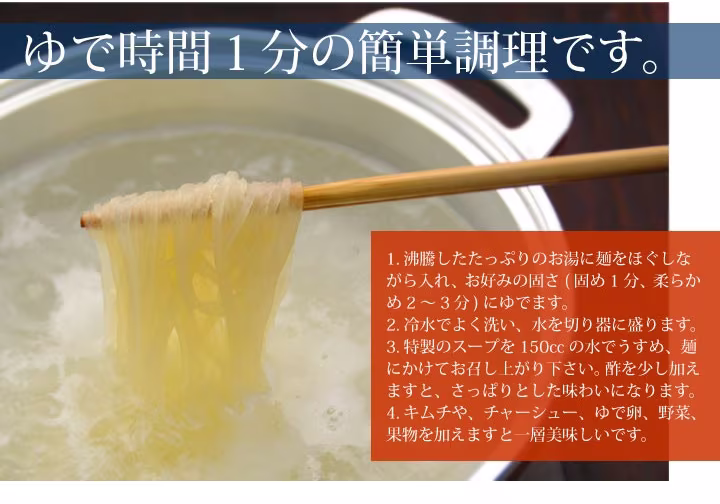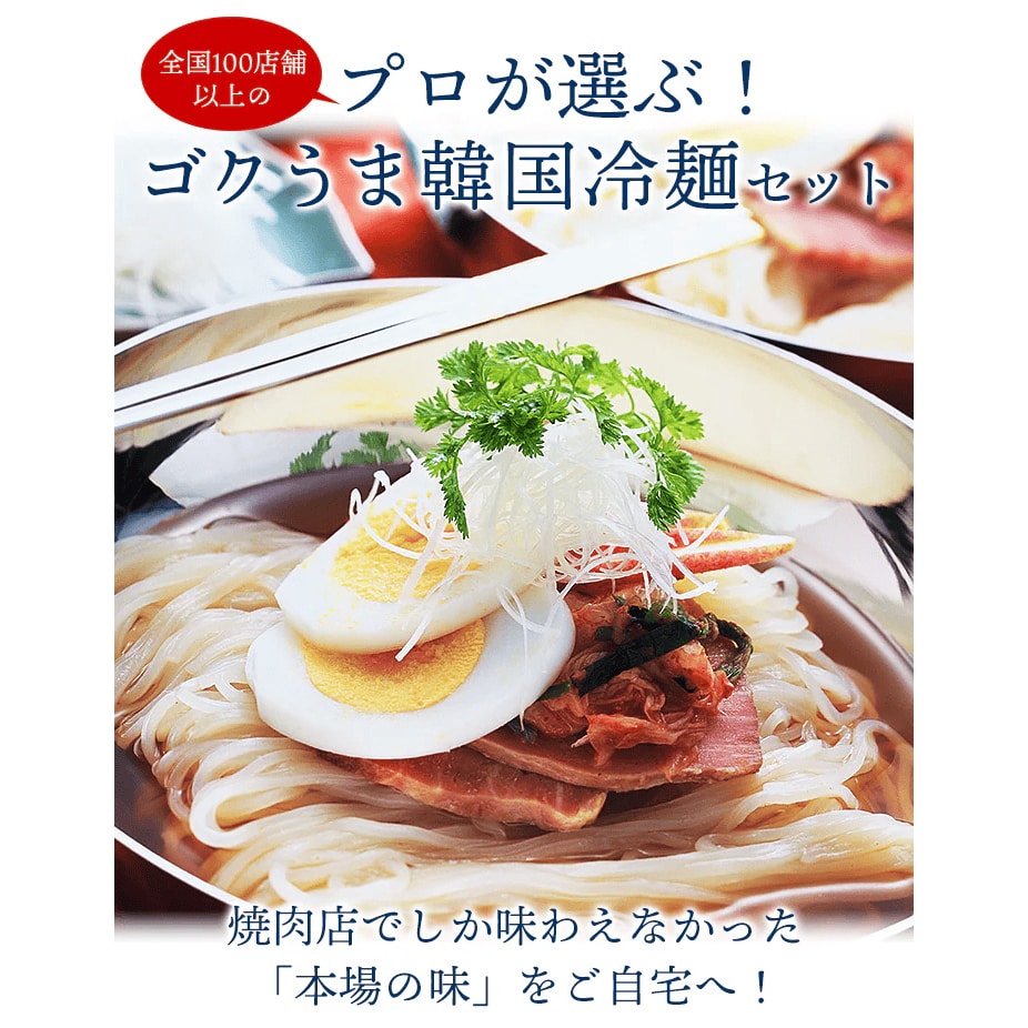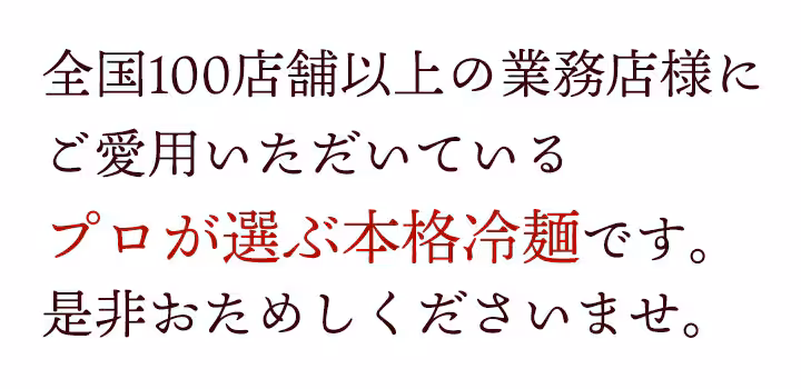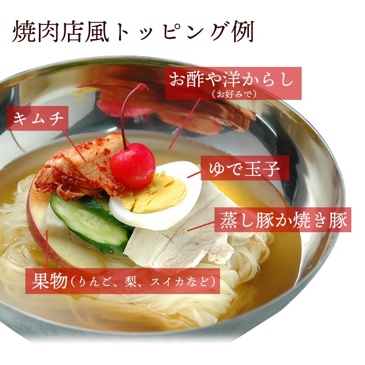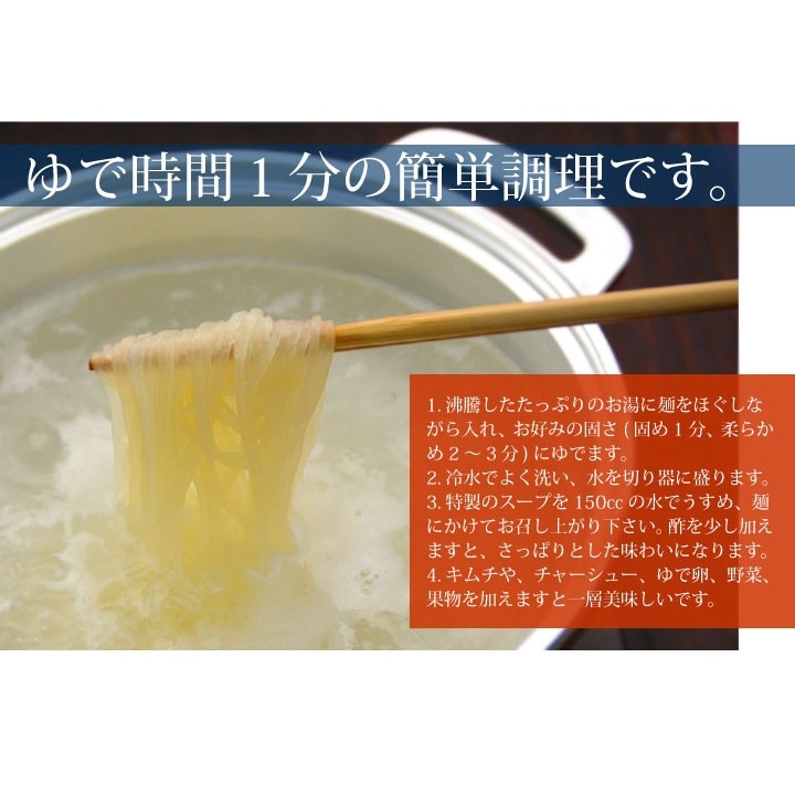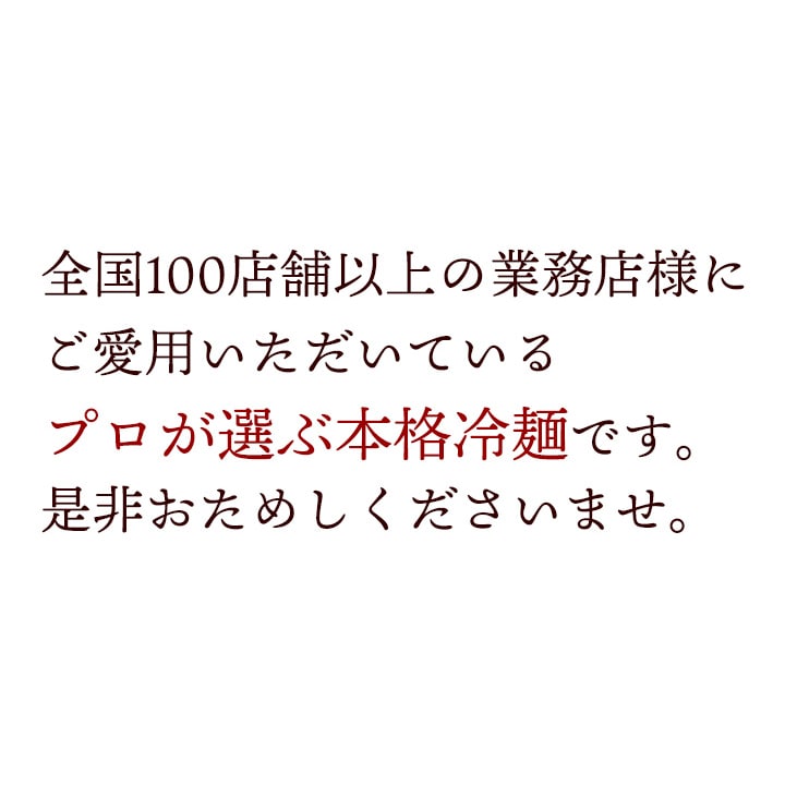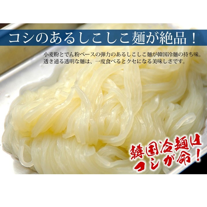 小麦粉をベースにした、歯応えのあるシコシコした麺が特徴です。ちょっぴり辛めのすっきりとした濃縮スープがセットされています。 キムチや蒸し豚、ゆで卵等を添えると、本格韓国料理店のあの味をお楽しみいただけます。茹でること1~2分と、調理も簡単です。 ※業務用対応のため、パッケージは簡易包装です。 【商品内容】韓国冷麺4食(麺120g×4、スープ30g×4) 【原材料名】 ●麺:小麦粉(国内製造)、でん粉、食塩/加工でん粉、酒精 ●スープ:砂糖混合異性化液糖(国内製造)、しょうゆ、食塩、醸造酢、肉エキス、香辛料/調味料(アミノ酸等)、増粘剤(グァー)、酸味料、カラメル色素、香料、(一部に小麦・牛肉・大豆を含む) 【賞味期限】30日以上保証 【保存方法】直射日光を避け、冷暗所にて保存してください。 【栄養成分表示】1食(麺120g、スープ30g)あたり エネルギー:362kcal、たんぱく質:6.5g、脂質:1.5g、炭水化物:80.6g、食塩相当量:5.7g(推定値) 【配送方法】常温便