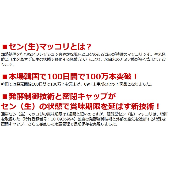 圧倒的に美味しい 本物の生マッコリ、伝統の龜(かめ)飲みスタイルでぜひ。 マッコリ「通」だからこそ、こだわります。確実に違いを魅せつける 本格セットです。贈り物としても最適です。 マッコリ好きには生唾モノなのは当然、マッコリ初心者にも、あっさり飲み易い生マッコリ、喜ばれること、間違いなしです。 【商品内容】麹醇堂マッコリ(クッスンダン)750ml×4本、マッコリ壺(1000ml)、マッコリ椀×4個、マッコリ用おたま 【原材料名】米、麹、ブドウ糖、クエン酸、乳酸、甘味料(アスパルテーム・L-フェニルアラニン化合物) 【賞味期限】30日以上保証 【保存方法】要冷蔵(10℃以下) 【配送方法】冷蔵便