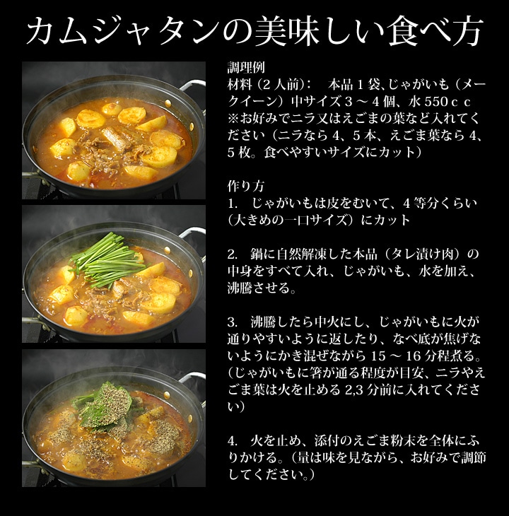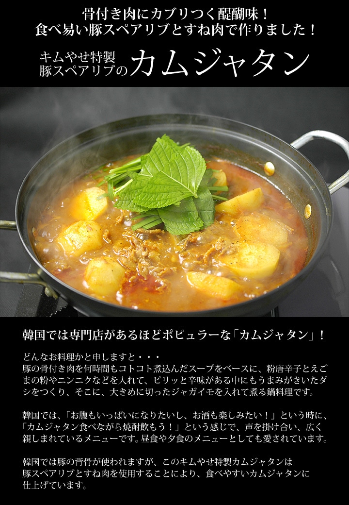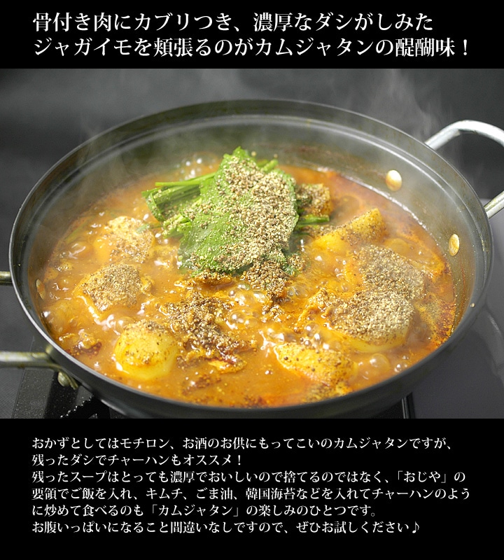 カムジャタン慕情ですっかりお馴染み。カムジャタンとは豚の骨付き肉をコトコト煮込み、唐辛子やえごまの粉末などを入れてピリ辛くコクのあるスープを作り、ぶつ切りのジャガイモを入れて作る鍋料理です。よく煮込まれた骨付き肉はご飯のおかずに、お酒の肴にとってもマッチする味。濃厚スープの味がよく染みたジャガイモの味も格別です。 韓国では材料に豚の背骨肉が使われることが多いのですが、少々食べにくいのが難点です。そこで本品は豚スペアリブとすね肉を使用することにより、とっても食べやすく仕上げています。 【商品内容】カムジャタン450g×2袋、えごま粉末 約13g×2袋 【原材料名】 ●タレ漬け肉:豚肉(国産、米国産)、水あめ、コチュジャン、発酵調味料、香辛料、味噌、醤油、にんにく、魚醤(魚介類)、昆布エキス、牛エキス調味料、生姜、三温糖、醸造酢、塩 / トレハロース、調味料(アミノ酸等)、カラメル色素、(一部に小麦・乳成分・豚肉・牛肉・ごま・大豆・魚醤(魚介類)を含む) ●えごま粉末:えごま(中国産) 【賞味期限】冷凍30日以上保証 【保存方法】要冷凍(-18℃以下) 【栄養成分表示(100gあたり)】エネルギー251kcal、たんぱく質7.9g、脂質14.6g、炭水化物20.6g、食塩相当量3.0g(推定値) 【配送方法】冷凍便