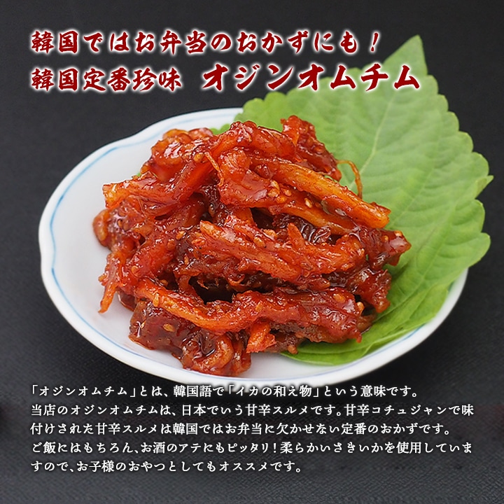 サキスルメを韓国風に甘辛く味付けしました。ビールやお酒のおつまみにピッタリ。 柔らかく食べやすいので、お子様にも人気です。 【商品名】甘辛スルメ(オジンオムチム)70g 【原材料名】さきいか(中国製造)、水あめ、みりん、コチュジャン、ごま油、醤油、ごま、唐辛子 / 調味料(アミノ酸等)、甘味料(ソルビトール)、酸味料、(一部に乳成分・小麦・いか・大豆・ごまを含む) 【賞味期限】製造日より60日 【保存方法】要冷蔵(5℃以下で保存) 【配送方法】冷蔵便