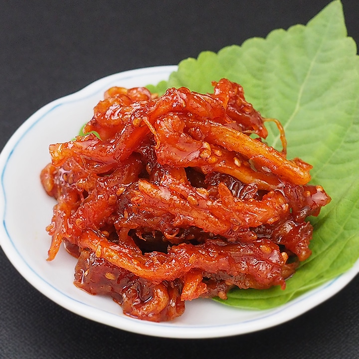 柔らかなさきいかを、自家製の甘辛いコチュジャンでじっくりと味付けしています。
