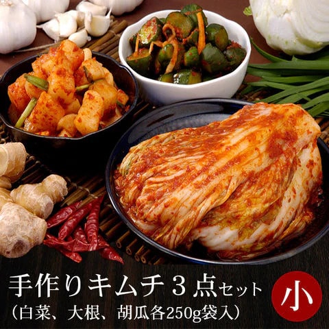 大阪鶴橋コリアタウンの在日コリアンの職人が作る、国産の本格手作り韓国キムチです。 コクのあるヤンニョム(キムチの素)は、クセになること間違いなし!辛いばかり、酸っぱいばかりのキムチではなく、ほんのり甘味も感じる奥深い味わいをお楽しみ下さい。 漬けたてを発送しますので、乳酸発酵により日ごとに変わるキムチの味を楽しみ、皆さん好みのキムチの味を発見してみてください。 【商品内容】白菜キムチ(カット済)250g、大根キムチ250g、胡瓜キムチ250g 【原材料名】 ●白菜キムチ:白菜(国産)、ニラ(国産)、漬け原材料(りんご、唐辛子、アミエビ、砂糖、にんにく、生姜、鰹節、塩) / 調味料(アミノ酸) ●大根キムチ:大根(国産)、漬け原材料(三温糖、唐辛子、にんにく、魚醤(魚介類)、塩、もち米粉、寒天、いか塩辛、昆布、かつお節、いりこ) / トレハロース、調味料(アミノ酸等)、(一部にいか・魚醤(魚介類)を含む) ●胡瓜キムチ:胡瓜(国産)、漬け原材料(唐辛子、砂糖、にんにく、塩、魚醤(魚介類)、醤油、ごま油、もち米、昆布、寒天、鰹削り節、いりこ、いか塩辛、ごま、牛肉エキス、酵母エキス) / 加工でんぷん、調味料(アミノ酸等)、(一部に小麦・乳成分・大豆・ごま・牛肉・いか・魚醤(魚介類)を含む) 【賞味期限】白菜・大根キムチ:製造日より14日、胡瓜キムチ:製造日より10日 【保存方法】要冷蔵(5℃以下) 【栄養成分表示】100gあたり ●白菜キムチ エネルギー:40kcal、たんぱく質:2.3g、脂質:0.4g、炭水化物:7.7g、食塩相当量:2.5g(推定値) ●大根キムチ エネルギー:59kcal、たんぱく質:0.9g、脂質:0.4g、炭水化物:12.5g、食塩相当量:2.4g(推定値) ●胡瓜キムチ エネルギー:52kcal、たんぱく質:1.4g、脂質:0.5g、炭水化物:11.6g、食塩相当量:1.7g(推定値) 【配送方法】冷蔵便
