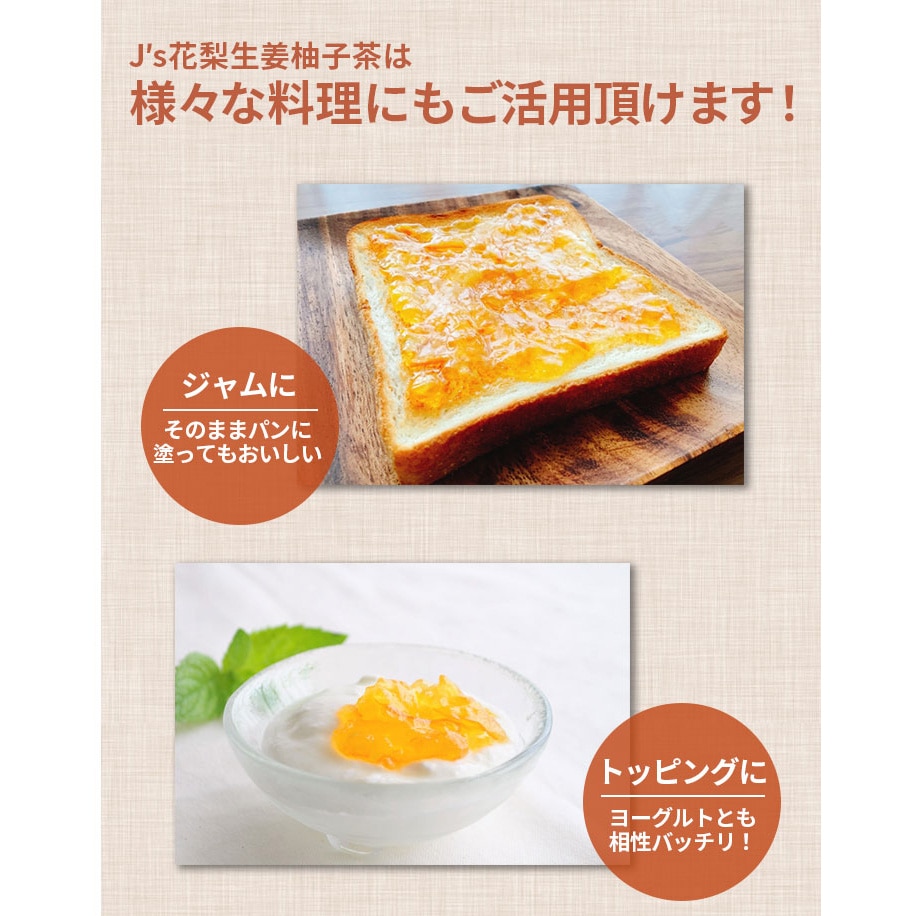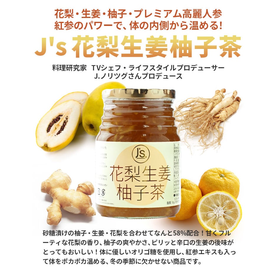 当店大人気商品柚子茶に、花梨、生姜入りの花梨生姜柚子茶が新登場!砂糖漬けの柚子・生姜・花梨を合わせてなんと58%配合! 甘くフルーティな花梨の香り、柚子の爽やかさ、ピリッと辛口の生姜の後味がとっても美味しい! お湯や炭酸水と割って飲んだり、トーストやヨーグルトと一緒にジャムとしてお使い頂いたり、お肉料理の隠し味としても相性抜群!体に優しいオリゴ糖を使用し、紅参エキスも入っているので体もポカポカ温める、冬の季節に欠かせない商品です! 【商品名】花梨生姜入り柚子茶580g×2本(瓶入り) 【原材料名】糖漬柚子、イソマルトオリゴ糖、糖漬生姜、糖漬花梨、蜂蜜、生姜濃縮液、シナモン粉末、生姜オレオレジン、紅参濃縮液/クエン酸、ビタミンC 【賞味期限】未開封常温保存 2027年1月22日 ※開封後は冷蔵庫で10℃以下保存。 【保存方法】直射日光、高温多湿を避け冷暗所で保存 (開封後は冷蔵庫で保存し、早めにお召し上がりください。) 【原産国名】韓国 【配送方法】常温便