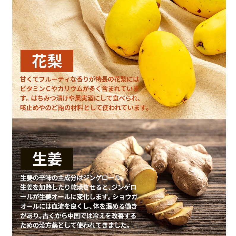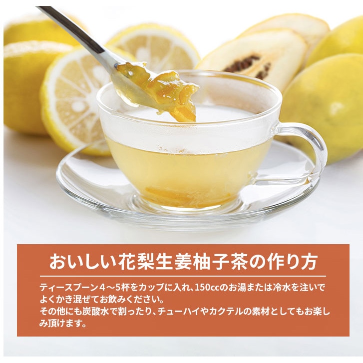 当店大人気商品柚子茶に、花梨、生姜入りの花梨生姜柚子茶が新登場!砂糖漬けの柚子・生姜・花梨を合わせてなんと58%配合! 甘くフルーティな花梨の香り、柚子の爽やかさ、ピリッと辛口の生姜の後味がとっても美味しい! お湯や炭酸水と割って飲んだり、トーストやヨーグルトと一緒にジャムとしてお使い頂いたり、お肉料理の隠し味としても相性抜群!体に優しいオリゴ糖を使用し、紅参エキスも入っているので体もポカポカ温める、冬の季節に欠かせない商品です! 【商品名】花梨生姜入り柚子茶580g(瓶入り) 【原材料名】糖漬柚子、イソマルトオリゴ糖、糖漬生姜、糖漬花梨、蜂蜜、生姜濃縮液、シナモン粉末、生姜オレオレジン、紅参濃縮液/クエン酸、ビタミンC 【賞味期限】未開封常温保存 2027年1月22日 ※開封後は冷蔵庫で10℃以下保存。 【保存方法】直射日光、高温多湿を避け冷暗所で保存 (開封後は冷蔵庫で保存し、早めにお召し上がりください。) 【原産国名】韓国 【配送方法】常温便