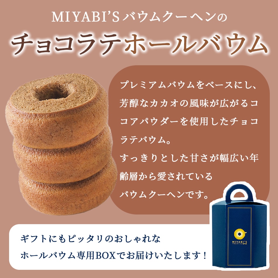 1本1本愛情を込めて作るふんわり新食感のバウムクーヘンは、特製の生地作りから、じっくり丁寧に時間をかけてふんわり焼き上げるまで…製造工程にもこだわってます。 チョコラテバウムは、濃厚なカカオの風味がたまらない老若男女に支持されるバウムクーヘンです。 バウムクーヘンとはドイツ語で「年輪」という意味です。 この年輪が、長寿と繁栄のしるしとして、結婚するふたりの年輪を重ね、いつまでも仲良くいられるようにという願いが込められており、大切な人への贈り物としてもおすすめです。 【商品内容】チョコラテバウム 1本 【原材料名】卵(国産)、プレミックス(砂糖、小麦粉、油脂、その他)、牛乳、食用油脂、砂糖、コーンスターチ、ココアパウダー、アーモンド粉末/乳化剤、加工でん粉、ベーキングパウダー、香料、着色料(カロテン)、酸化防止剤(無水亜硫酸)、増粘剤(キサンタンガム)、pH調整剤、(一部に卵・乳成分・小麦・アーモンド・大豆を含む) 【賞味期限】製造日より30日 【保存方法】直射日光を避け、冷暗所にて保存してください。 【配送方法】常温便