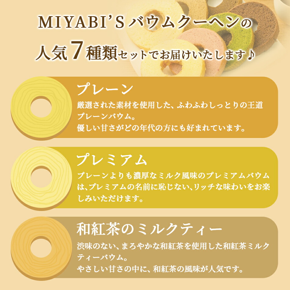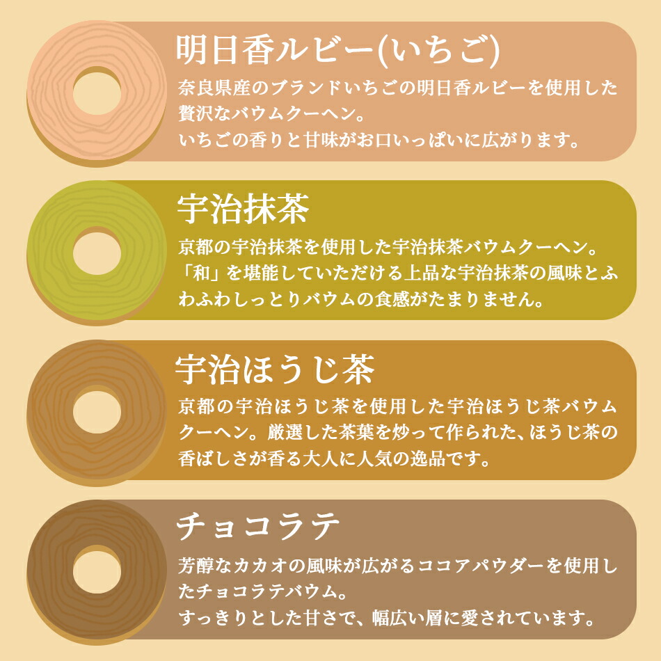 【商品内容】カットバウム21個セット(プレーン×3、プレミアム×3、明日香ルビー(いちご)×3、チョコラテ×3、宇治抹茶×3、宇治ほうじ茶×3、和紅茶のミルクティー×3) 【原材料名】 ●プレーン:卵(国産)、プレミックス(砂糖、小麦粉、油脂、その他)、食用油脂、砂糖、コーンスターチ、アーモンド粉末、ラム酒/乳化剤、加工でん粉、ベーキングパウダー、香料、着色料(カロテン、カラメル)、酸化防止剤(無水亜硫酸)、増粘剤(キサンタンガム)、pH調整剤、(一部に卵・乳成分・小麦・アーモンド・大豆を含む) ●プレミアム:牛乳(国内製造)、卵、プレミックス(砂糖、小麦粉、油脂、その他)、食用油脂、砂糖、コーンスターチ、アーモンド粉末/乳化剤、加工でん粉、ベーキングパウダー、香料、着色料(カロテン)、酸化防止剤(無水亜硫酸)、増粘剤(キサンタンガム)、pH調整剤、(一部に卵・乳成分・小麦・アーモンド・大豆を含む) ●明日香ルビー(いちご):卵(国産)、プレミックス(砂糖、小麦粉、油脂、その他)、食用油脂、砂糖、いちごソース(いちご、砂糖)、コーンスターチ、アーモンド粉末/乳化剤、加工でん粉、ベーキングパウダー、pH調整剤、着色料(ラック、カロテン)、酸味料、香料、酸化防止剤(無水亜硫酸)、増粘剤(キサンタンガム)、(一部に卵・乳成分・小麦・アーモンド・大豆を含む) ●チョコラテ:卵(国産)、プレミックス(砂糖、小麦粉、油脂、その他)、牛乳、食用油脂、砂糖、コーンスターチ、ココアパウダー、アーモンド粉末/乳化剤、加工でん粉、ベーキングパウダー、香料、着色料(カロテン)、酸化防止剤(無水亜硫酸)、増粘剤(キサンタンガム)、pH調整剤、(一部に卵・乳成分・小麦・アーモンド・大豆を含む) ●宇治抹茶:卵(国産)、プレミックス(砂糖、小麦粉、油脂、その他)、牛乳、食用油脂、砂糖、コーンスターチ、アーモンド粉末、抹茶/乳化剤、加工でん粉、ベーキングパウダー、香料、着色料(カロテン)、酸化防止剤(無水亜硫酸)、増粘剤(キサンタンガム)、pH調整剤、(一部に卵・乳成分・小麦・アーモンド・大豆を含む) ●宇治ほうじ茶:卵(国産)、プレミックス(砂糖、小麦粉、油脂、その他)、牛乳、食用油脂、砂糖、コーンスターチ、アーモンド粉末、ほうじ茶/乳化剤、加工でん粉、ベーキングパウダー、香料、着色料(カロテン)、酸化防止剤(無水亜硫酸)、増粘剤(キサンタンガム)、pH調整剤、(一部に卵・乳成分・小麦・アーモンド・大豆を含む) ●和紅茶のミルクティー:牛乳(国内製造)、卵、プレミックス(砂糖、小麦粉、油脂、その他)、食用油脂、砂糖、コーンスターチ、アーモンド粉末、和紅茶/乳化剤、加工でん粉、ベーキングパウダー、pH調整剤、香料、着色料(カロテン)、増粘剤(キサンタンガム)、酸化防止剤(無水亜硫酸)、(一部に卵・乳成分・小麦・アーモンド・大豆を含む) 【賞味期限】製造日より30日 【保存方法】直射日光、高温多湿を避け冷暗所で保存 【配送方法】常温便