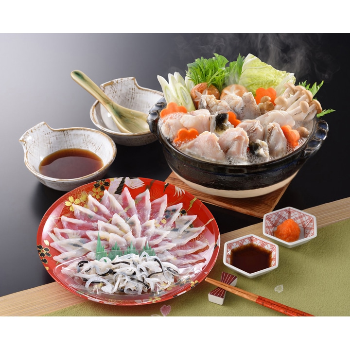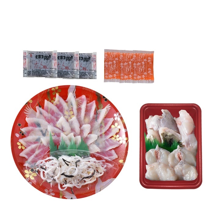 下関の職人が1枚1枚丹念に盛り付けた、身が固くしまり、歯ごたえが堪らないとらふく刺身と、とらふくの身とアラをぶつ切りにしたとらふくちり鍋をセットにしています。ちり鍋後のスープで、ふく雑炊もお楽しみいただける商品です。 【商品内容】とらふぐ刺身(22cm皿)45g、とらふぐ皮20g、とらふぐちり(切身、アラ)200g、ふくポン酢10g×3、もみじおろし10g×3 【原産地】トラフグ(長崎県産、熊本県産:養殖)、大根(国産) 【アレルギー指定食品(28品目)】小麦・大豆 【賞味期限】冷凍90日 【保存方法】要冷凍(-18℃以下で保存) 【配送方法】冷凍便 ※こちらの商品はメーカー直送の為、他の商品とは同梱出来ません。