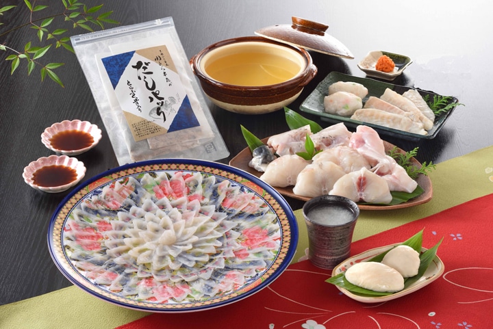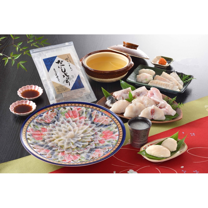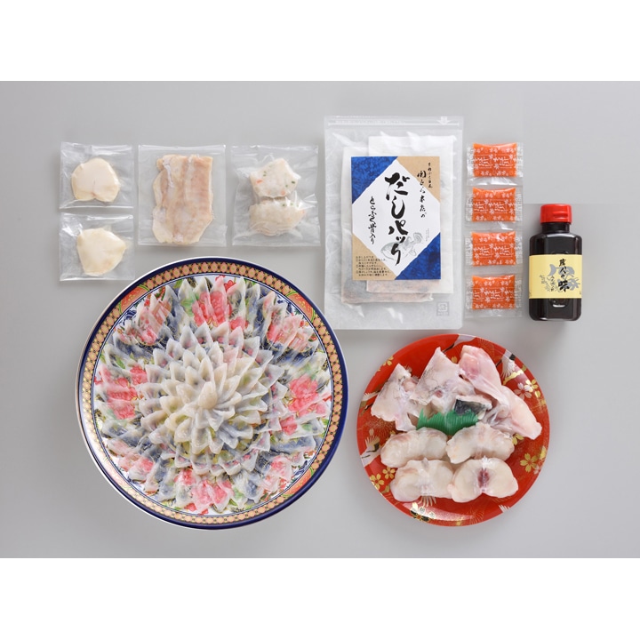 料亭「下関ふく百花 関とら本店」では下関の関門海峡を一望しながら、ふく料理をご堪能いただけます。30年以上にわたり、全国にふくをお届けしてきた熟練のふく職人による技が光るふく料理をギフト用に仕立てました。ちり鍋はかつおぶし、うるめ、こんぶととらふくの中骨を干して焼いたものでだしをとっています。焼き白子は白子酒にしても、そのまま食べても美味しくお召し上がりいただけます。またとらふく一匹から2枚しかとれない身皮とふくしんじょうをつけています。「プロの調理場からご家庭の食卓へ」、関とら本店でお出ししているそのままのふく料理をご家庭でお楽しみください。 【商品内容】とらふぐ刺身(30cm皿)110g、とらふぐちり(切身、アラ)300g、とらふぐ身皮4枚、とらふぐ焼白子(白子酒用)20g×2、ふぐしんじょう40g×2、だしパック(とらふぐ骨入り)18g×2、ふくポン酢180ml、もみじおろし10g×4 【原産地】トラフグ(長崎県産、熊本県産:養殖)、大根(国産) 【アレルギー指定食品(28品目)】小麦・さけ・大豆・やまいも 【賞味期限】冷凍90日 【保存方法】要冷凍(-18℃以下で保存) 【配送方法】冷凍便 ※こちらの商品はメーカー直送の為、他の商品とは同梱出来ません。